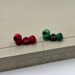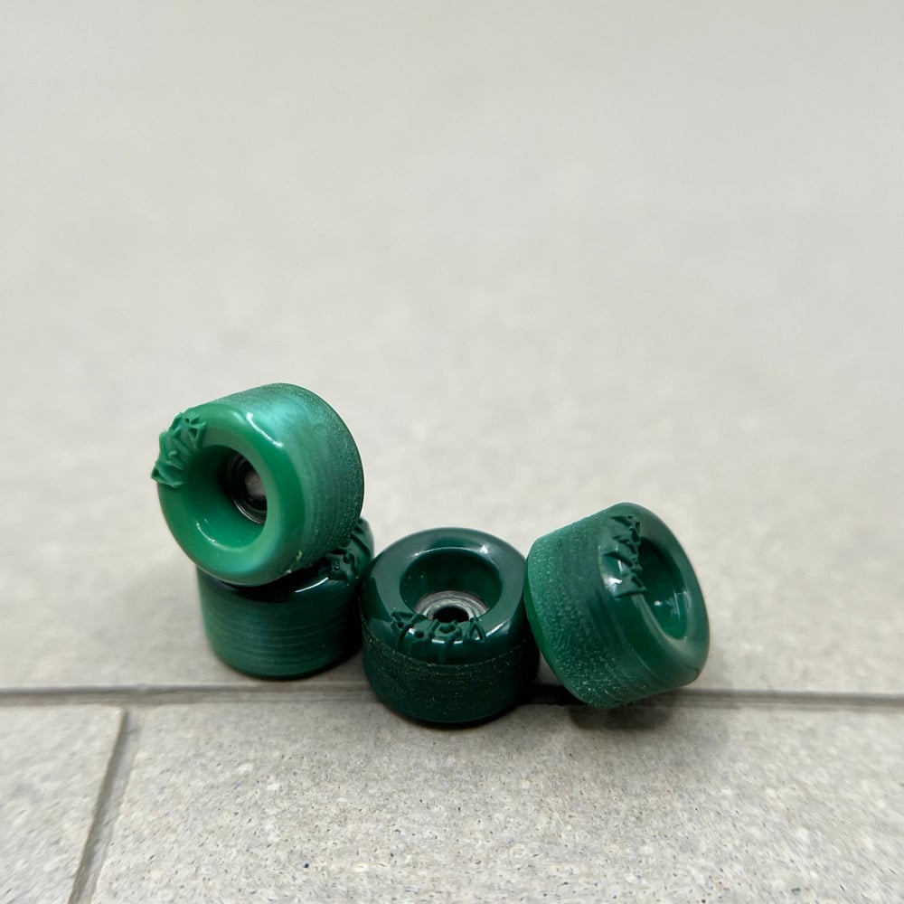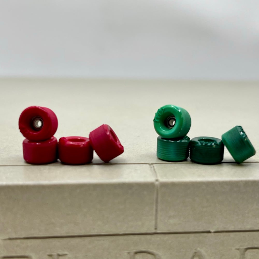 These sets are dyed from white F3 to red and dark green. Each wheel is unique and some wheels have a bit more swirl than others.