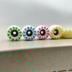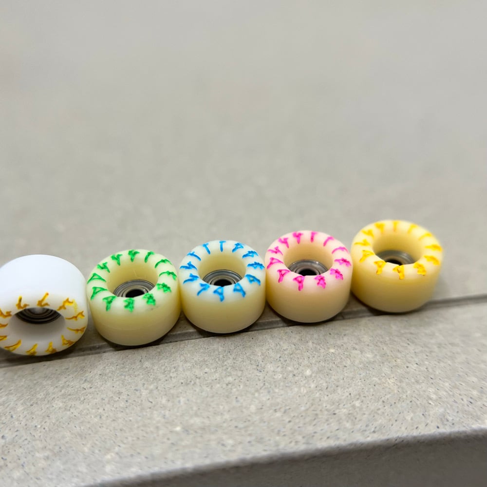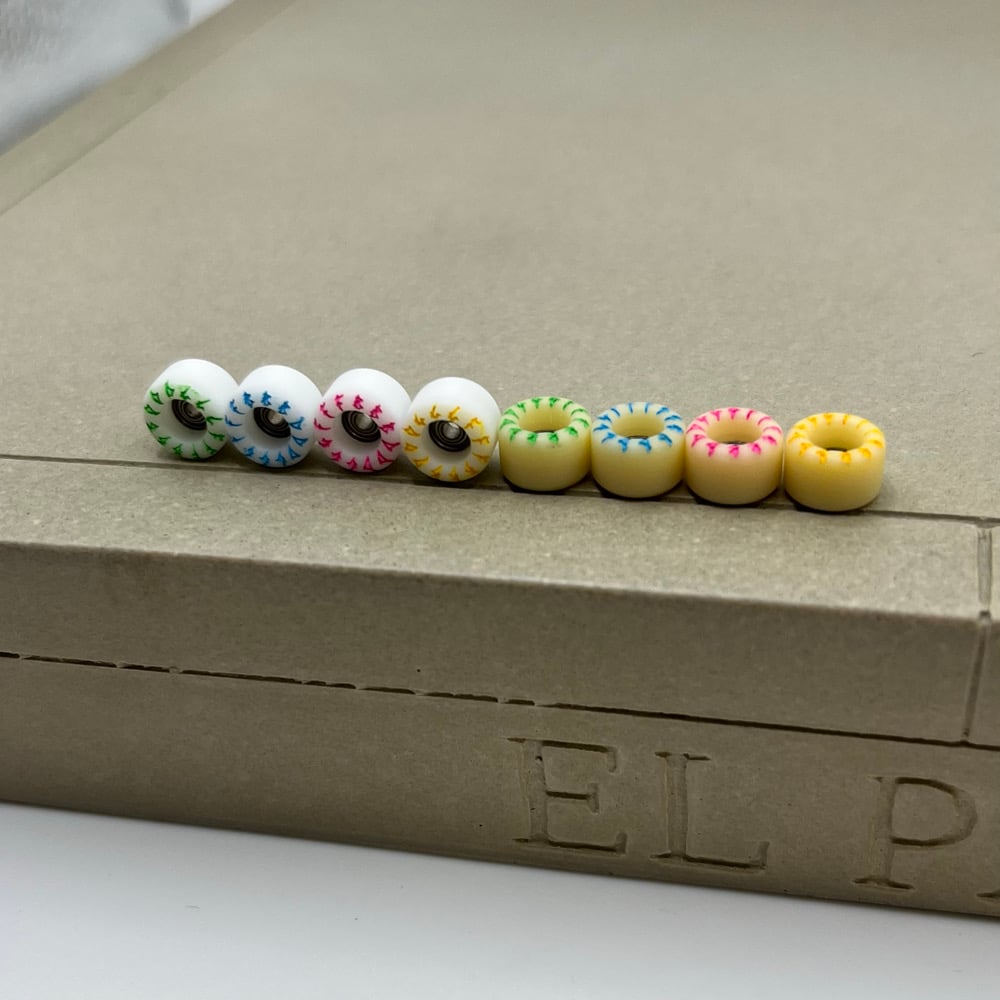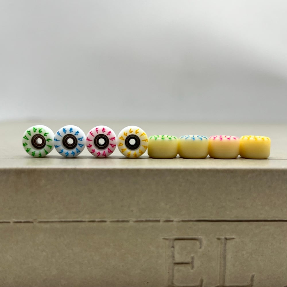 The F2 material is 70D and represent a more classic "hard urethane" wheel. For those who started fingerboarding on plastic wheels and like a hard board feel with a bit more freedom to revert and power slide, these wheels were made with you in mind.